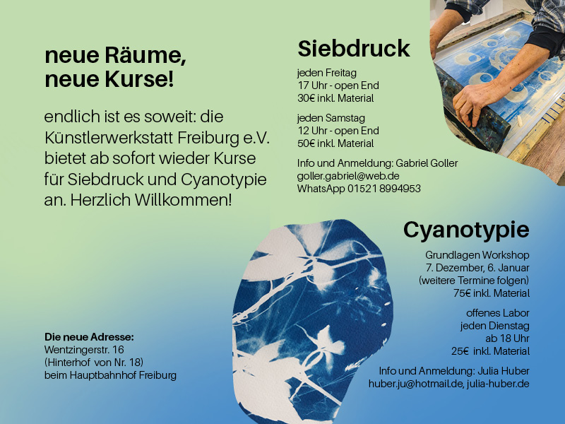 Ab November werde ich in der neuen Druckwerkstatt der Künstlerwerkstatt e.V. (ehemals L6) Cyanotypie-Kurse anbieten.