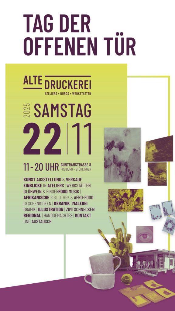 Wie in den letzten Jahren öffnet die alte Druckerei im November wieder ihre Türen. Neben duftenden Zimtschnecken, Keramik und leckerem afrikanischem Essen gibt es viel Kunst aus unserem und weiteren Ateliers zu sehen.